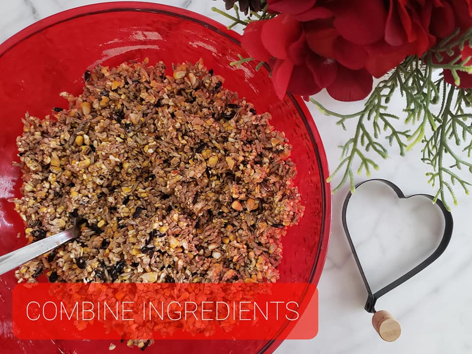 MATERIALS: 4 cups mixed bird seed 3/4 cup all purpose flour 1/2 cup water 3 Tbsp corn syrup cooking spray cookie cutters twine